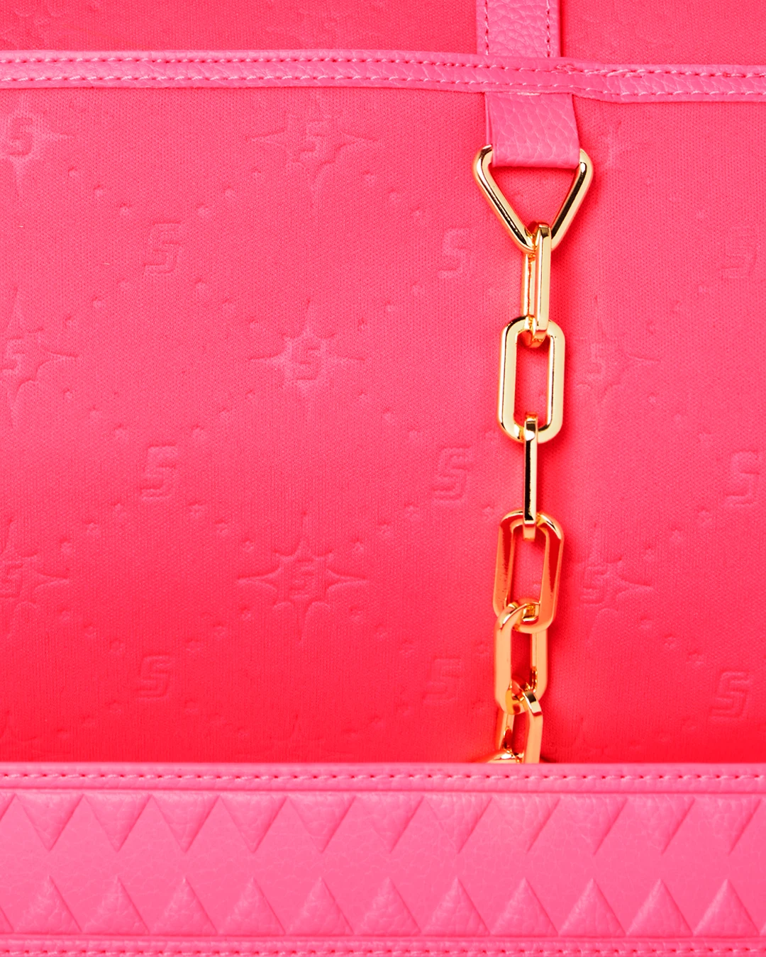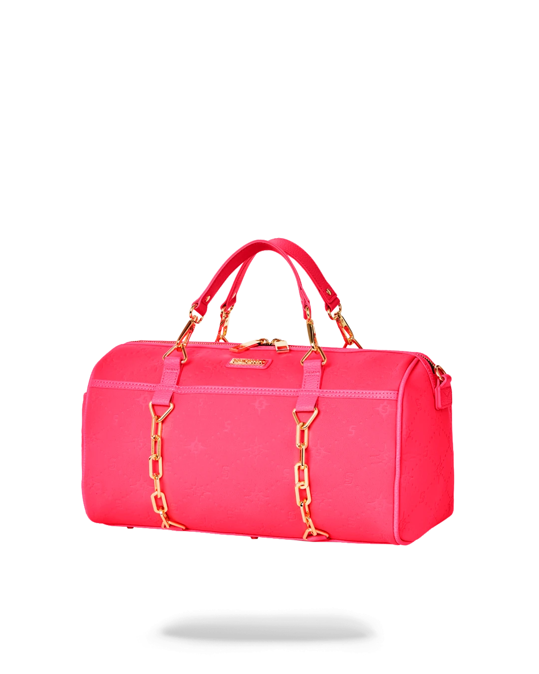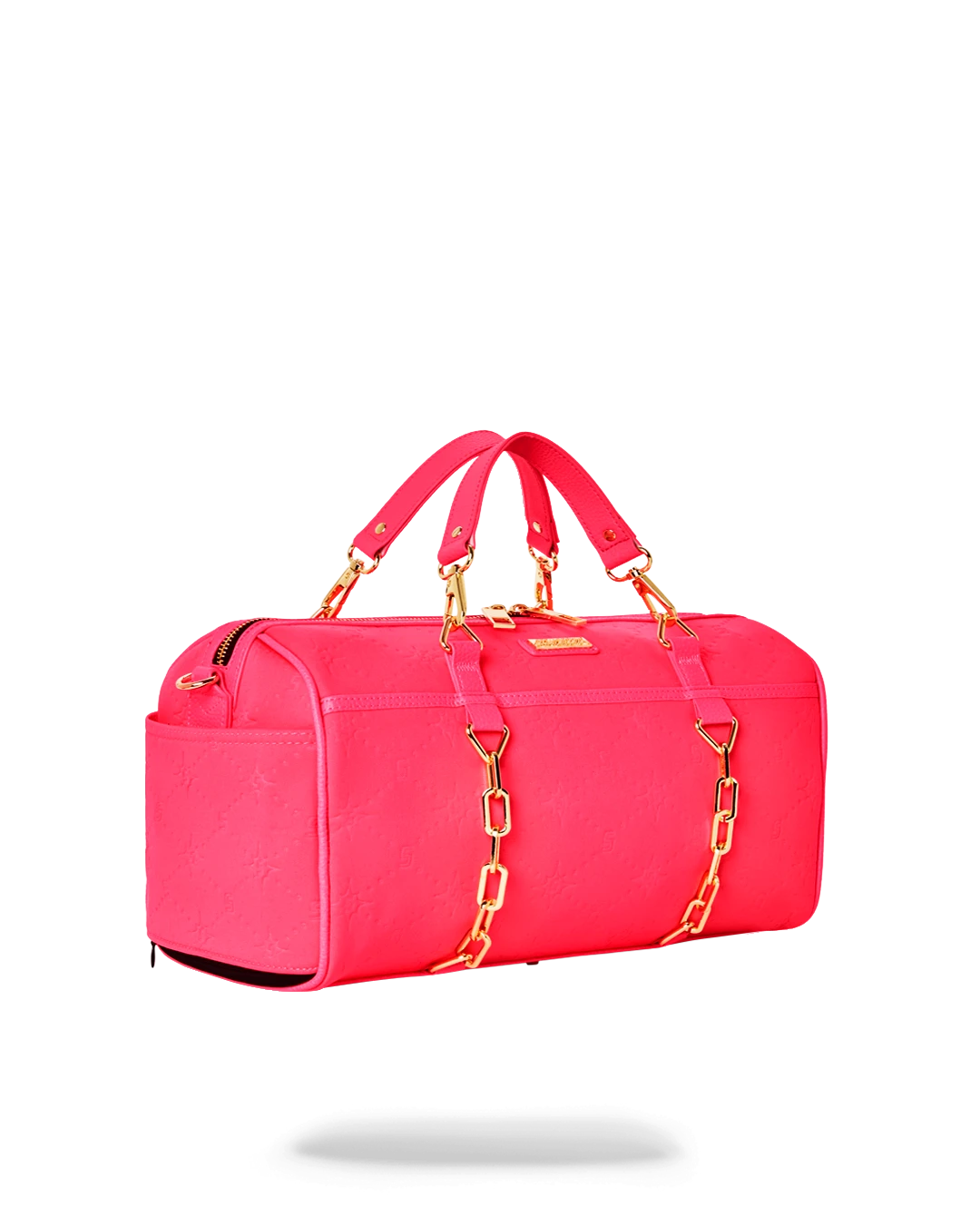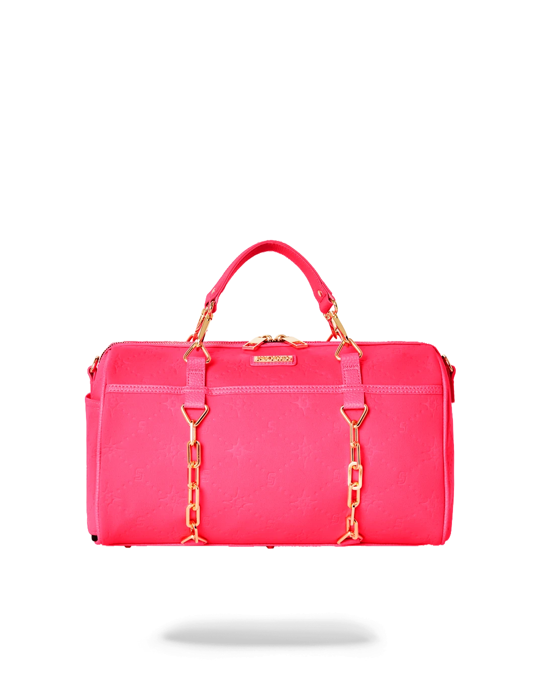 Sporty neoprene fabric embossed with custom Sprayground logo pattern.