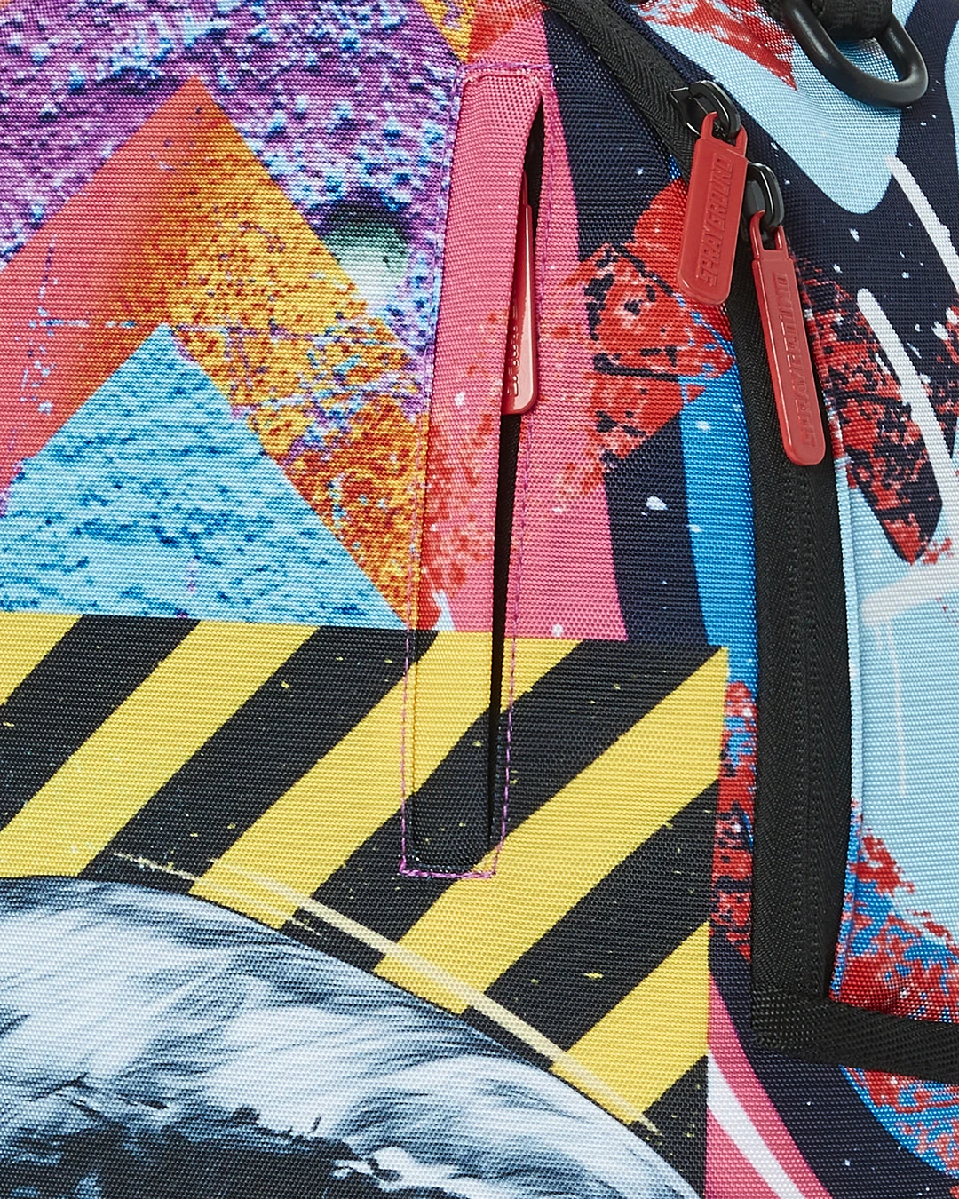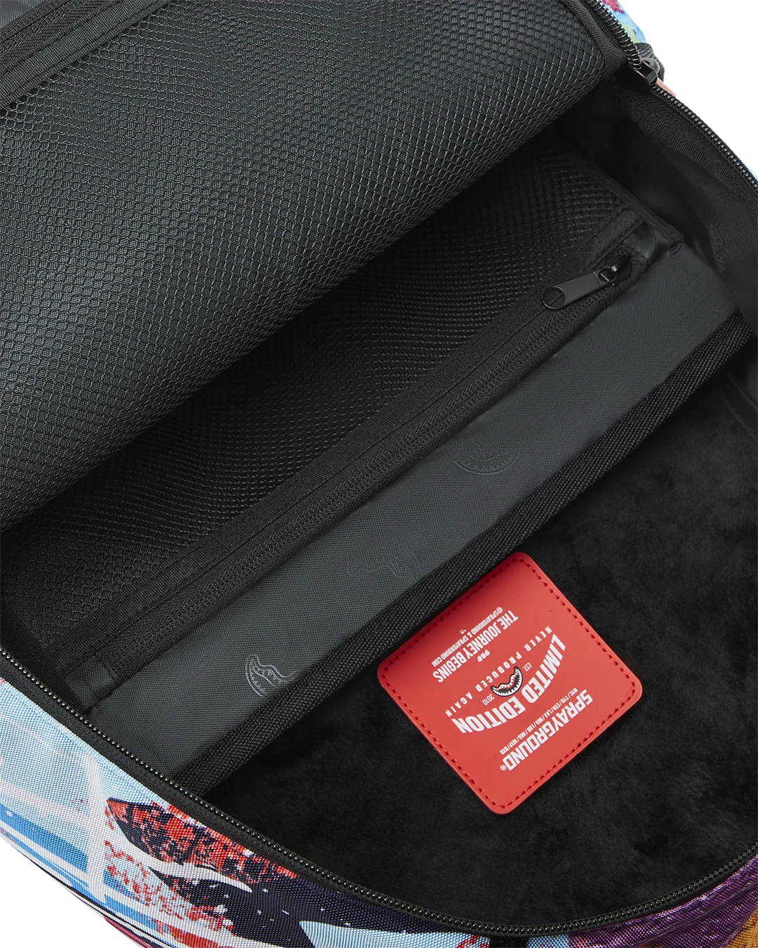 Dimensions: 18″ x 6″ x 11.5″ • Front zipper pocket • Side pockets • Zippered Stash pocket • Separate velour sunglass compartment • Ergonomic mesh back padding • Adjustable Straps for custom sizing • Gold zippers with metal hardware • Metal “Sprayground Authentic” badge • Slide through back sleeve connects to carry-on luggage to free your hands