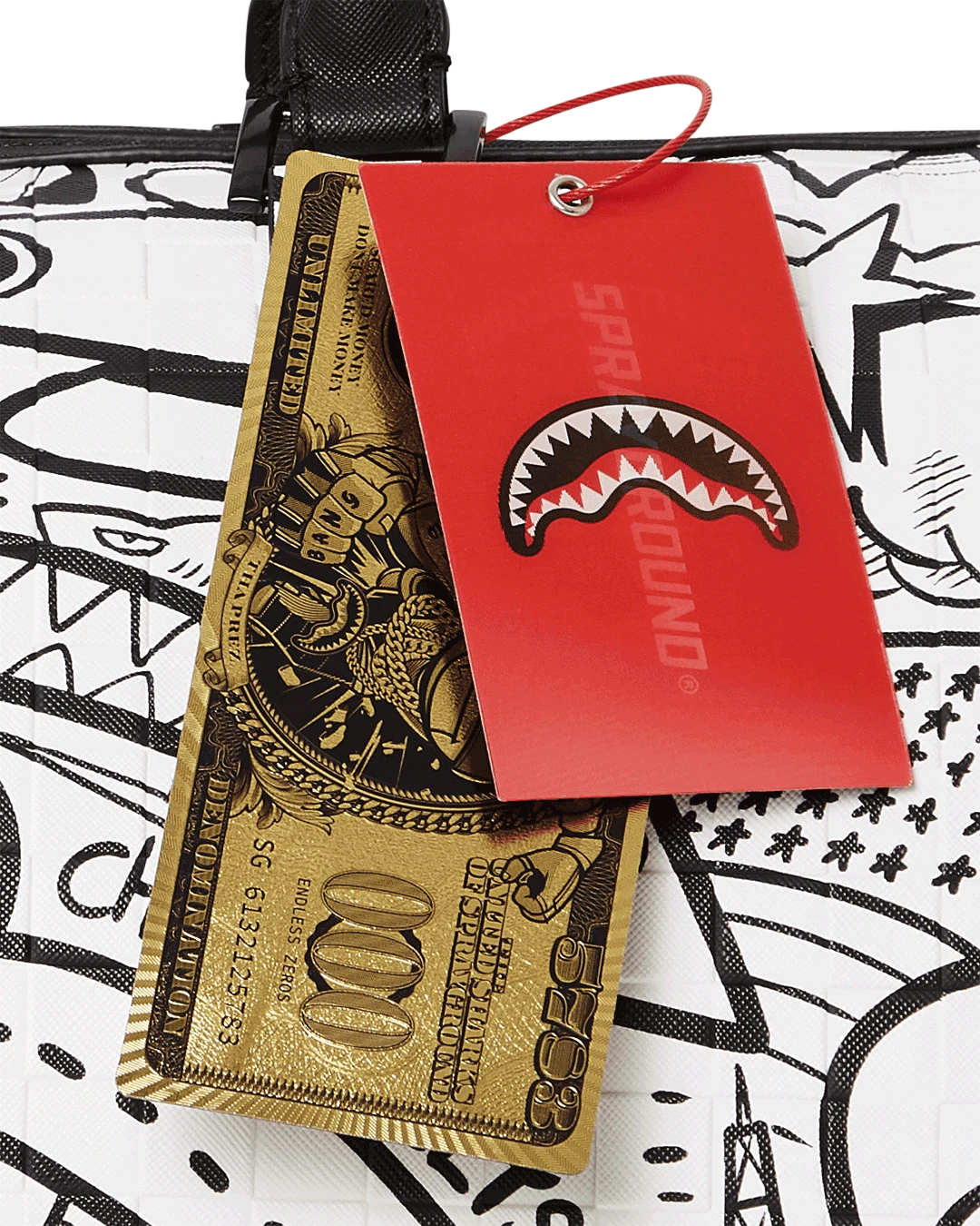 Dimensions: 20″ x 10″ x 10.75″ • Metal zipper pocket• Back Zippers •Zippered sneaker pocket • gold zippers • Adjustable Straps for custom sizing •Metal Zippers with Metal Hardware • bag of Sprayground money