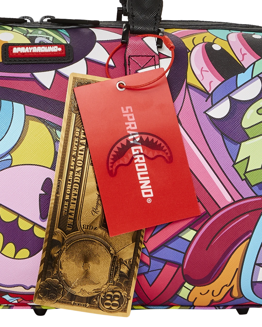 Dimensions: 8″ x 7.5″ x 13″ • Metal zipper pocket• Back Zippers •Zippered sneaker pocket • gold zippers • Adjustable Straps for custom sizing •Metal Zippers with Metal Hardware • bag of Sprayground money